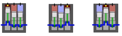 Starting from left fire 1: piston 1 is at the top and is going downward, thus generates an upward force to the left end of the crankshaft. Piston 2 is also going downward, thus generates an upward force to the middle of the crankshaft. Piston 3 is going upward, thus generates a downward force to the right end of crankshaft. As the engine’s center of gravity locates at cylinder 2, forces from piston 1 push the left end of the engine upward while forces from piston 3 push the right end of the engine downward; After 180 degrees rotation, the situation is completely reversed downward force at left and upward force at the right. This is an end-to-end vibration with respect to the engine center at cylinder 2.